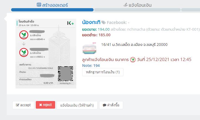 ตัวอย่างการโอนสลิปมาจากผู้ซื้อมาให้กับตัวแทนที่ขายผ่านช่องทางอื่นๆ