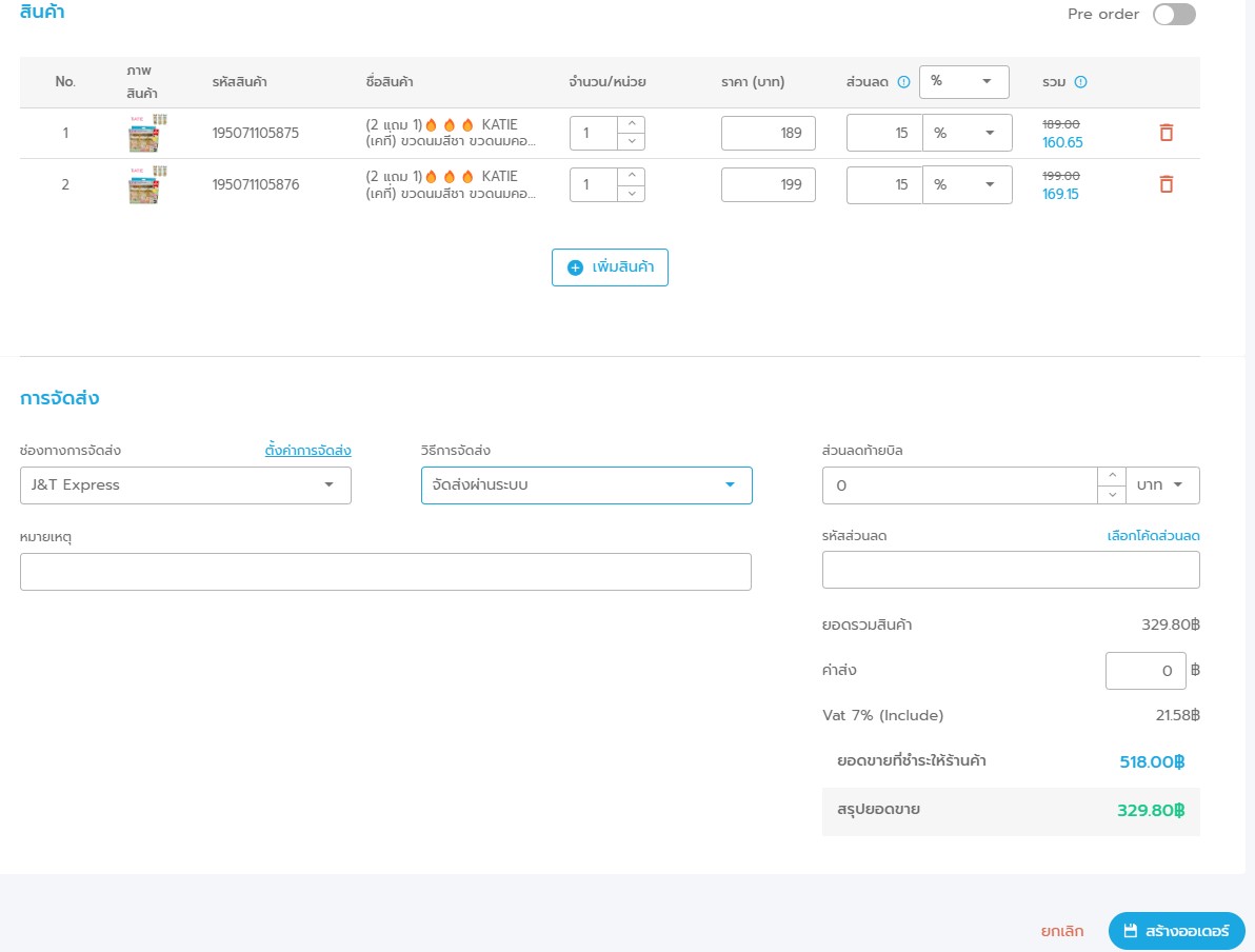 4.กด +สร้างออเดอร์ (มุมขวาล่าง) พื่อสร้างออเดอร์เข้าระบบมาให้กับทางบริษัท