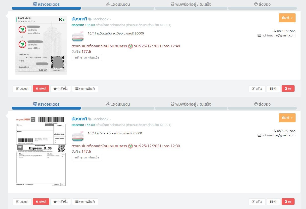 กดเมนูคัดลอกรายละเอียดการสั่งซื้อสินค้าจาก คำสั่งซื้อ แล้วส่งรายละเอียดการซื้อสินค้าให้กับผู้ซื้อ โดยทางผู้ซื้อจะเป็นคนกรอกข้อมูลต่างๆ เช่น ชื่อ ที่อยู่เอง แล้วจะแนบสลิปเงินมาให้กับทางตัวแทน เมื่อผู้ซื้อชำระเงินแล้ว ระบบจะแสดงสลิปการโอนเงิน และข้อมูลการจัดส่ง ตรวจสอบข้อมูลต่างๆ หลังจากนั้นกด accept เพื่อยอมรับออเดอร์ และกดแจ้งโอนเงิน(ให้ร้านค้า) เพื่อโอนเงินให้กับบริษัท เมื่อโอนชำระเงินแล้ว สามารถยืนยันกับทางบริษัทผ่านทางไลน์อีกครั้ง เมื่อแนบสลิปการโอนเงินให้กับทางบริษัทแล้ว ทางบริษัทจะดำเนินการแพ็คของและจัดส่งสินค้าให้กับลูกค้า ซึ่งลิงก์นี้จะอัพเดตทุกสถานะจนถึงขั้นตอนการจัดส่ง ตัวแทนสามารถตรวจสอบสถานะได้จากลิงก์นี้ได้เช่นกัน
